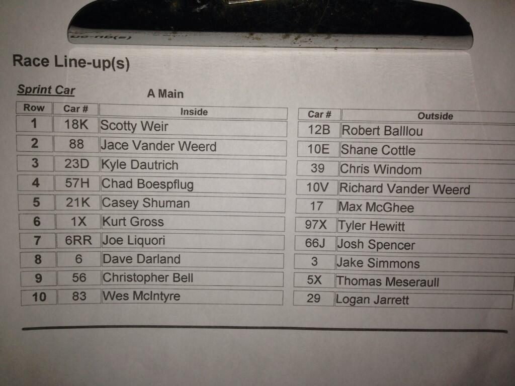 ![]() KirkSpridgeon Kirk Spridgeon 50s Kokomo Feature Lineup pic.twitter.com/C7fwuhEiTq Robert Ballou @robertballou81 1m Feature pushing off Robert Ballou @robertballou81 1m Green!! Robert Ballou @robertballou81 47s 5 laps in Ballou weir Cottle windom Robert Ballou @robertballou81 1m Cottle to 2nd